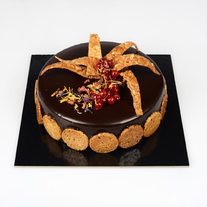 Pan di Spagna al cioccolato, riso soffiato e nutella, bavarese al cioccolato e alla nocciola, ricoperto con glassa al cioccolato fondente